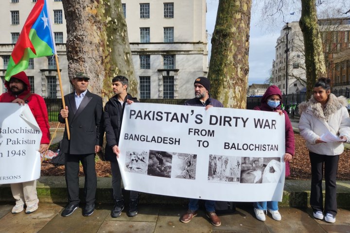 Baloch people living in the UK protest opposite British Prime Minister's Rishi Sunak's official residence at 10 Downing Street, London,…