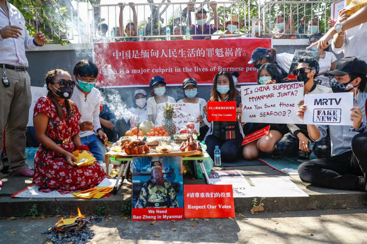 File photos of people protesting against China in Myanmar