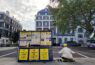 His brightly-coloured blue and yellow stall on the pavement also grabs the attention of passersby. It screams in big and bold letters: “Stop persecuting Falun Gong”. On the other side the board has text messages proclaiming – “Truthfulness, Compassion and Forbearance” in numerous languages including Mandarin, English, Hindi and Russian.