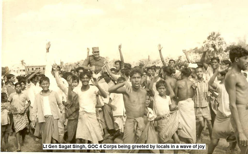 The people in East Pakistan cheered Indian soldiers. They give a rousing welcome to an Indian Army officer, Lt. General Sagat Singh.