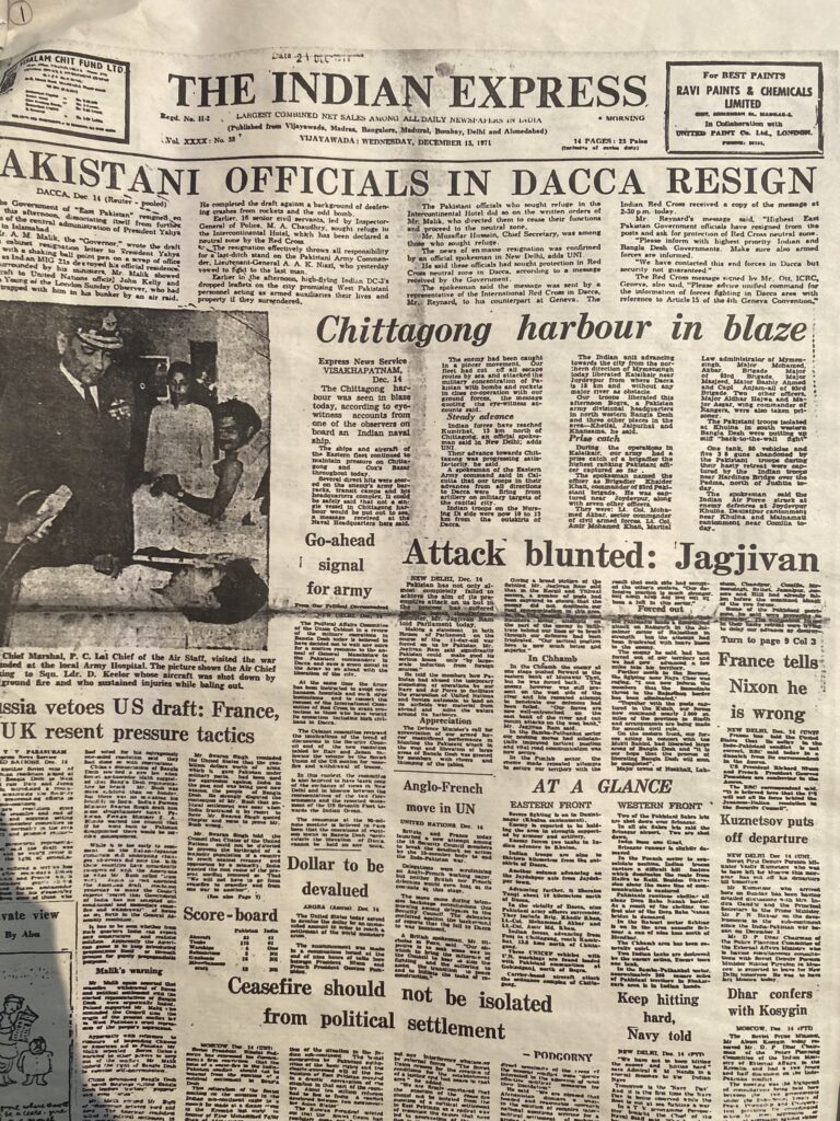 The news of the surrender by Pakistan troops is reported in banner headlines.