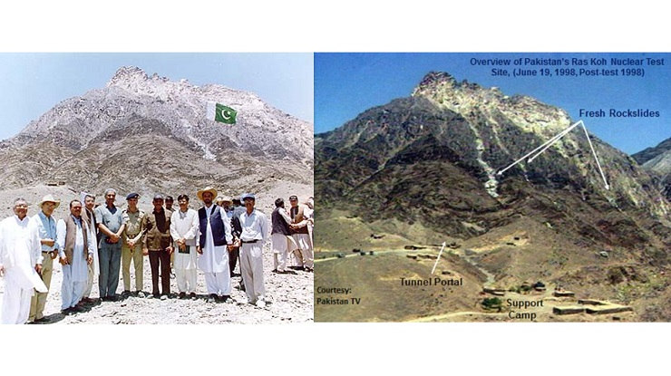Pakistani scientists at the Chagai Hills nuclear test site on 28 May 1998, with then Prime Minister Nawaz Sharif hidden behind on the right (Photo: millat.com); the photograph on the right shows site planning by the Pakistani Army (Photo: Pakistan Army Faceboook)