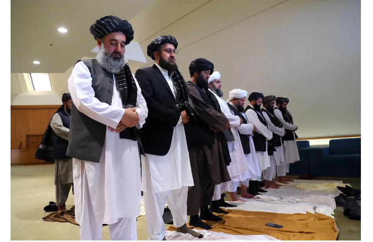 File photo of the Taliban delegation praying before signing the Doha accord with the US in Qatar in 2020 (Photo: Twitter)